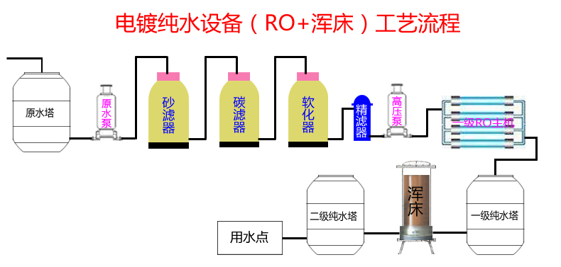 离子交换工艺流程:自来水→多介质过滤器→活性炭过滤器→软化水器→中间水箱→低压泵→精密过滤器→阳树脂床→阴树脂床→阴阳树脂混合床→用水点。