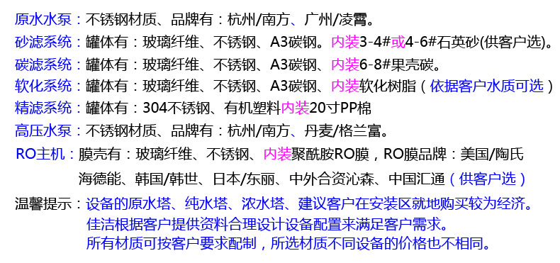 软化器:内装强酸性苯乙烯、具有耐酸碱、交换容量高、交换速度快机械强度好、主要是去除水中的有机物和形成水垢的物质使进水符合反渗透设备的进水要求延长设备的使用寿命。