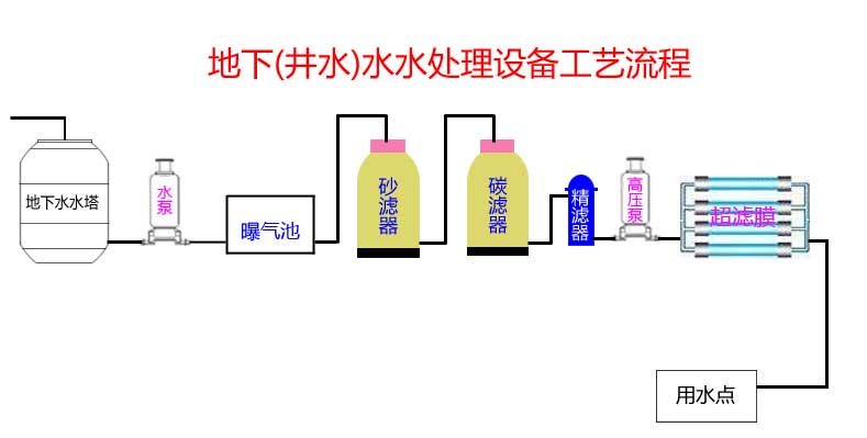 井水—水泵—曝气池—砂滤—碳滤—超滤系统—市政自来水
