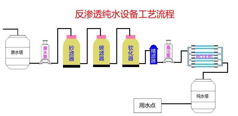 反渗透纯水设备也可称这一级反渗透纯水设备它是由:原水泵,原水罐,石英砂过滤器,活性碳过滤器,精滤器,高压泵,RO主机,纯水箱,控制电路,九个主要部件组合成了反渗透纯水设备(如果水质较硬有结垢现像可添加软化系统解决)。反渗透纯水设备工作时是原水泵将原水加压经过石英砂过滤器、活性炭过滤器、精密过滤器等,再通过高压泵泵加压,利用孔径为1/10000μm(相当于大肠杆菌大小的1/6000,病毒的1/300)的反渗透膜(Ro膜),使较高浓度的水变为低浓度水,同时将污染物、重金属、细菌、病毒等大量混入水中的杂质全部隔离,水温在25°c左右时出水电导率可保证在10us/cm以内,且反渗透主机的除盐率在99%以上,从而得到至清至纯的纯水。
