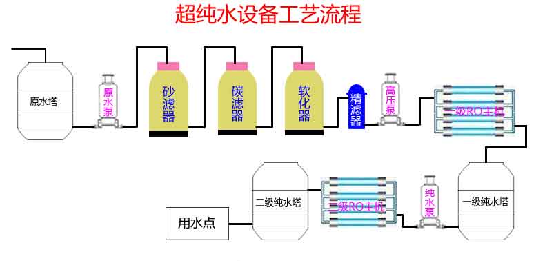 原水箱—原水泵—多介质过滤器—活性炭过滤器—软水器→保安过滤器→高压泵—反渗透主机→纯水箱—纯水泵→阴阳离子交换混床→微孔过滤器—储水罐→纯水输送泵→用水点
