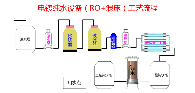 常用工艺(RO+浑床):自来水→砂过滤器→碳过滤器→精密过滤器→一级反渗透→一级纯水箱→学浑床→超纯水箱→用水点(电阻率≥10MΩ) 。些工艺要间隔性对阴阳树脂进行再生,再生时会有酸碱废水排出,些工艺设备成本经济实惠适,是众电镀制品多客户的首选设备。