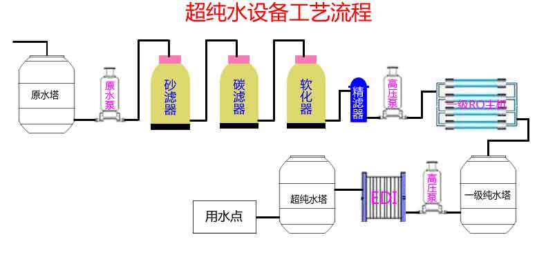 1:离子交换工艺:自来水→高压泵→多介质过滤器→活性炭过滤器→软化水器→低压泵→精密过滤器→阳树脂床→阴树脂床→阴阳树脂混合床→微孔过滤器→用水点