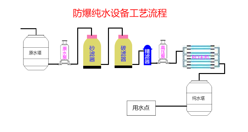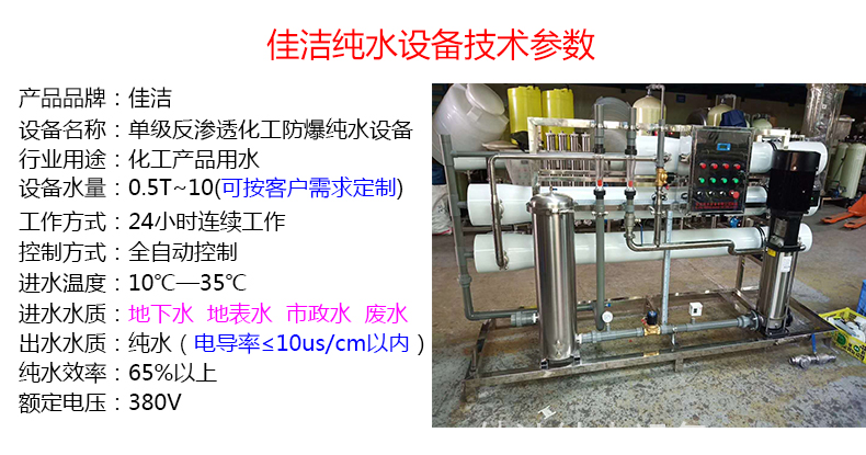 东莞佳洁纯水设备开研发生产的工业化工行业防爆纯水机组主体工艺为 原水箱→原水泵→石英砂过滤器→活性炭过滤器→精密过滤器→高压泵→反渗透系统(RO)→纯水箱。