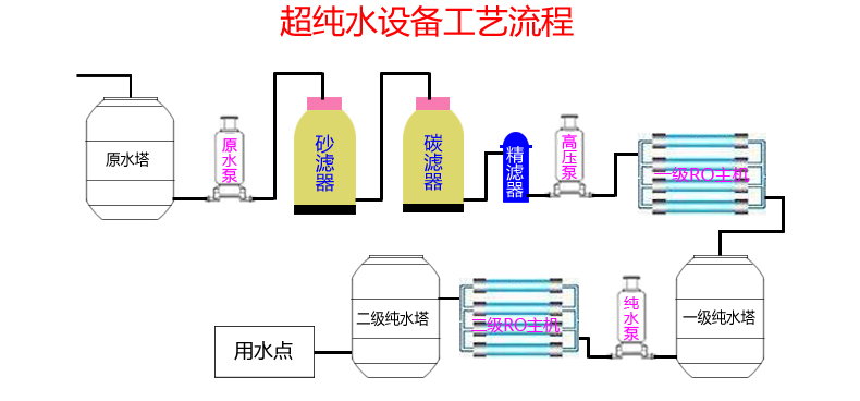 二级反渗透纯水设备也称为双级反渗透纯水设备,它是由两组级别的RO膜组成水由砂罐。碳罐,精滤过滤后直接进入RO主机后分离出来的纯水再由高压泵加压后再次进入RO主机,经过第二次分离后使水质变的更纯来供给生产用水点直接使用的系统。一级反渗透纯水设备工作时是原水泵将原水加压经过石英砂过滤器、活性炭过滤器、精密过滤器等,再通过高压泵泵加压经过两组孔径为1/10000μm(相当于大肠杆菌大小的1/6000,病毒的1/300)的反渗透RO膜,使较高浓度的水变为低浓度水,同时将污染物、重金属、细菌、病毒等大量混入水中的杂质全部隔离,水温在25°c左右时出水电导率可保证在0.1~0.055us/cm以内,且反渗透主机的除盐率在99%以上,从而得到至清至纯的纯水。