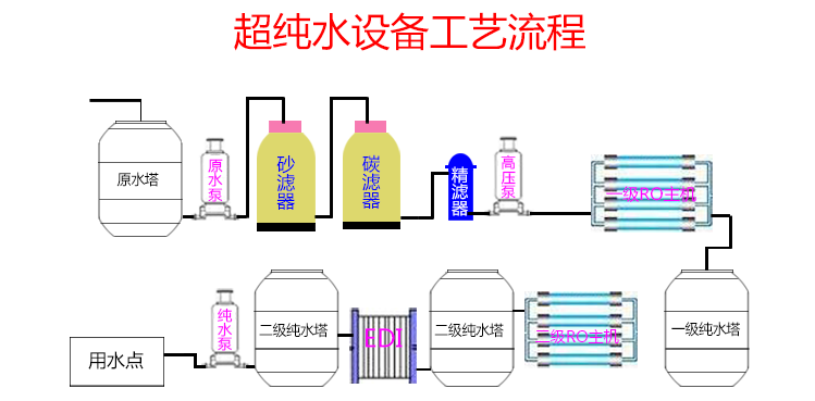 1:原水箱→原水泵→石英砂过滤器→活性炭过滤器→保安过滤器→RO一级反渗透→一级纯水箱→纯水增压泵→二级反渗透→二级纯水箱→EDI系统→超纯水箱→超纯水压泵→用水点.