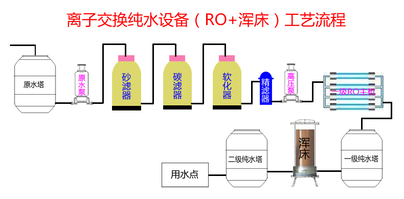 混床超纯水设工艺是反渗透、ED有机地组合在一起,达到高效去除污染物以及深度脱盐的目的一种水处理工艺,处理后的出水可直接满足锅炉补给水、工艺用水、电子超纯水、回用水、循环用水等要求该工艺已成功应用于电力、冶金、石化等多个领域。此工艺的关键技术EDI系电渗析(ED)和离子交换技术(DI)有机结合,达到连续除盐、运行维护简单、无酸碱排放污染。