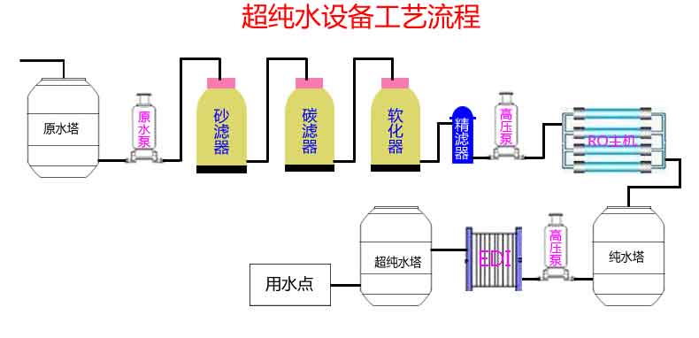 原水→原水泵→石英砂过滤器→活性炭过滤器→软化器→精密过滤器→一级反渗透→中间水箱→中间水泵→EDI模块→微孔过滤器→超纯水用水点