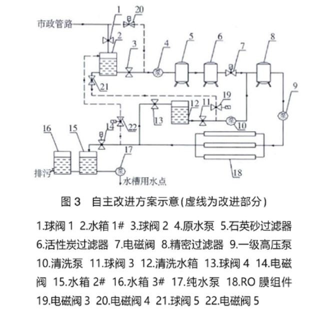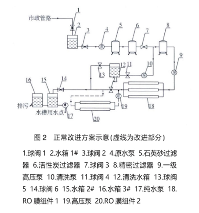 (8)正常改进方案,如图2所示在现有设备RO组件纯水出水口加一高压水泵(8m3/H150m程)串两套过滤膜管,加装一套浓水量与纯水量调节控制阀将单级过滤改为二级过滤每小时能生产出4t左右,电导率在10μs/cm以下的纯水费用约4.5万元(膜管2根×6000元/根,过滤膜4根×5400元/根,高压水泵1台×6000元/台其他管材和施工费约5000元)