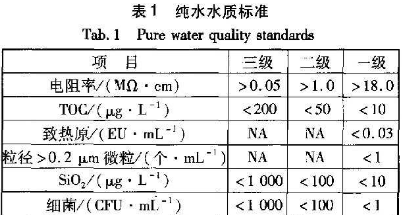 不同实验室所需的纯水水质也可能各不相同。许多国际组织(ASTM,NCCLS,CAP,USP)也都有自己所颁布的纯水水质标准和指南,这都将帮助设计者确定适当的水质。其中,经大多数用户认可的3种标准如表1所示(三级水指一般纯水,二级水为分析级,一级水为超纯水)。三级水一般用在玻璃器皿清洗等日常试验中,而对于更加敏感的研究实验则需要用二级水甚至一级水。